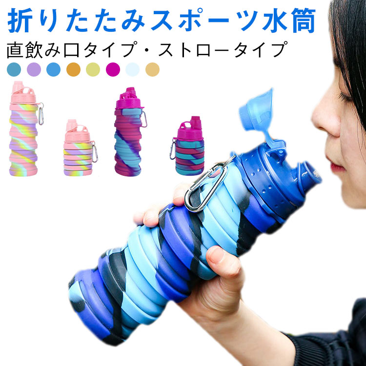 スポーツ用 漏れ防止 直飲み ストロー スポーツ用 シリコンボトル 折りたたみ式 カラビナ付き スポーツ水筒 ボトル 軽量 コンパクト収納 ウォーターボトル 携帯用 自転車 登山 アウトドア 迷彩柄