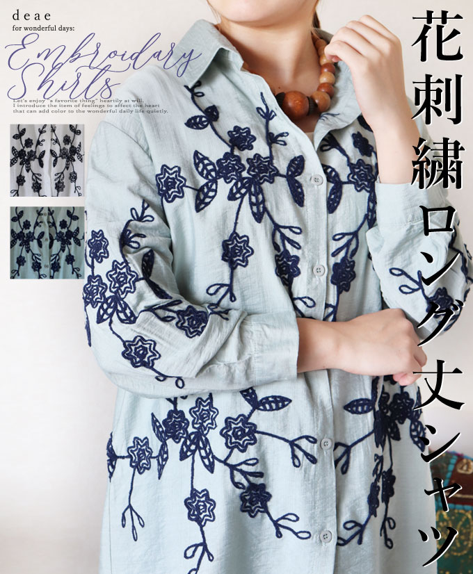 トップス ロング丈 シャツ 長袖 ブラウス 花刺繍 北欧風 レディース カジュアル ホワイト セージ 30代 40代 50代 60代 「花刺繍でほっこり華やぐ ロング丈長袖トップス」
