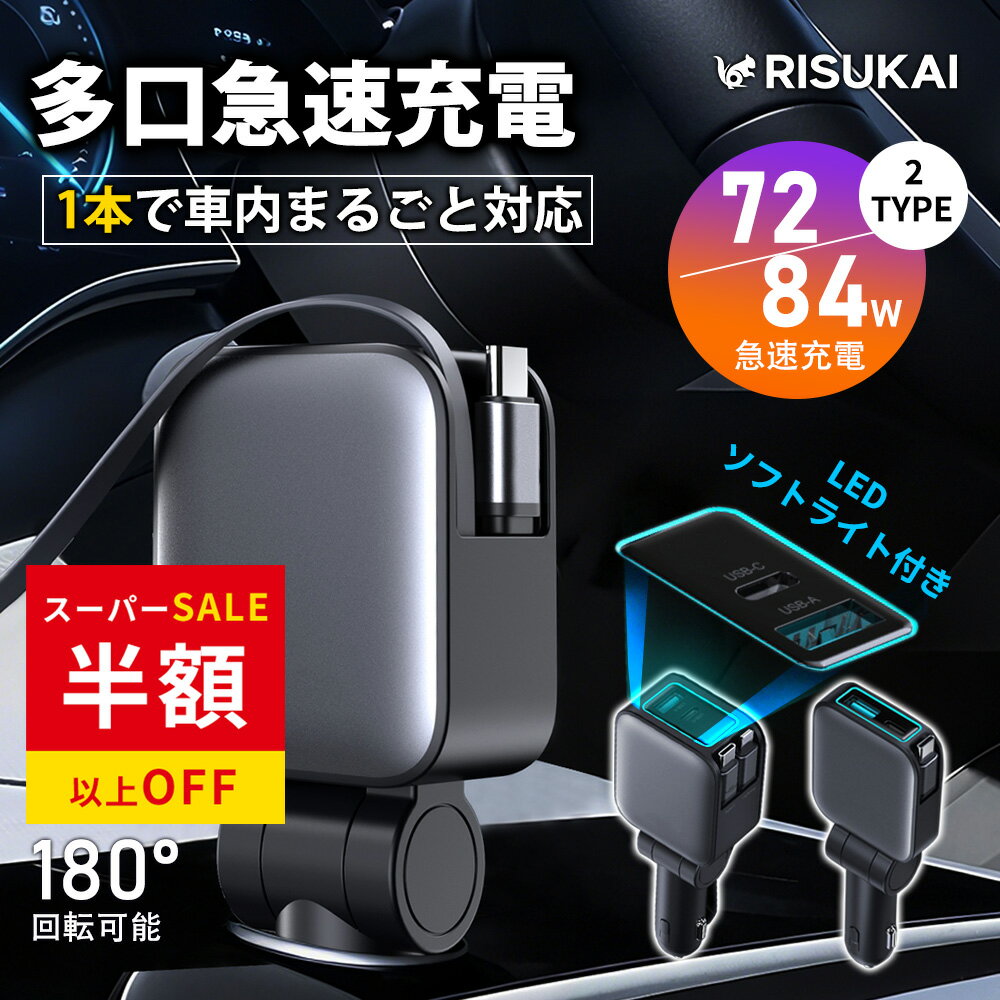ZC6 A型〜H型 BRZ シガーソケット用充電ケーブル&ポート 4in1 USB 充電器 PD 60W 急速 Type-C Lightning ケーブル内蔵 巻取式 2ポート