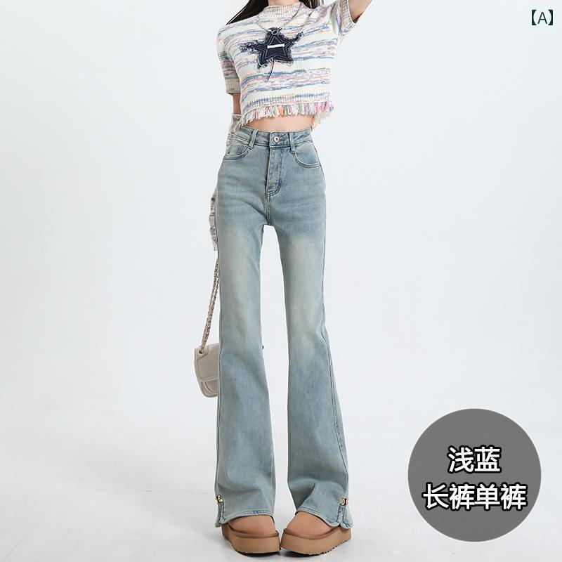 レディース カジュアル パンツ デニム 女性用 ライト カラー スリット ブーツ カット ジーンズ 春 ハイウエスト スリミング 多目的 フロア レングス ベルボトム