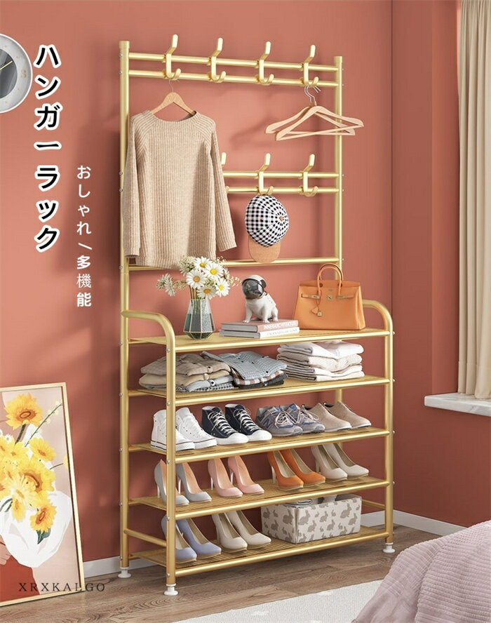 時間全品10ハンガーラック 頑丈 大容量 おしゃれ 棚付き コートハンガー 玄関 収納 省スペース 丈夫 収納付きハンガーラック洋服掛け 衣類収納 服掛雑物 シンプル 組み立て式 ブラック ゴールド