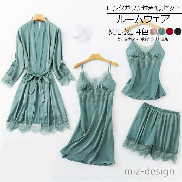 【送料無料】ルームウェア レース 可愛い シルクタッチ サテン ロングガウン付き4点セット セクシー ルームウェア ナイトウェア 薄手 サラサラ 軽く 無地 パジャマ
