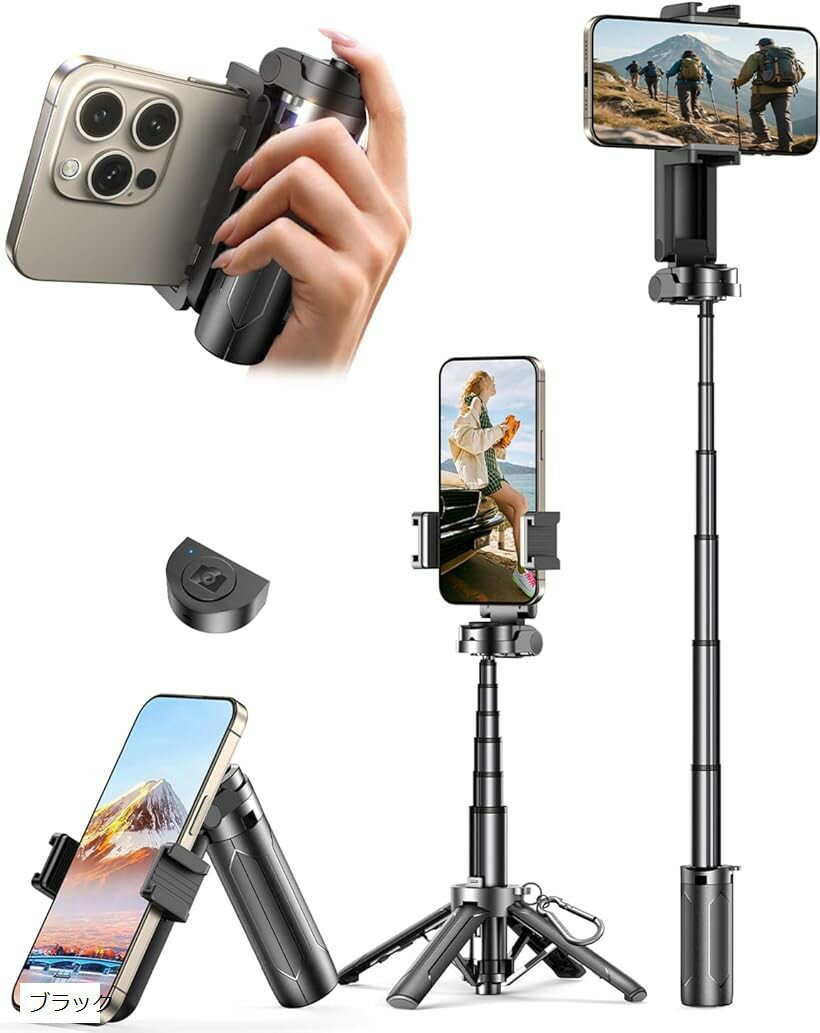 ブロガー愛用・4in1モデル 自撮り棒 スマホスタンド スマホグリップ スマートフォン用三脚 ダブル360°回転 じどり棒 軽量コンパクト セルカ棒 折りたたみ式 ブラック