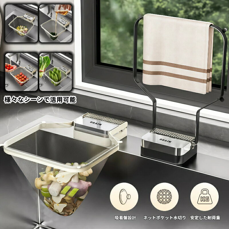 吸盤式 シンク用 水切りゴミ受け 折りたたみ式 ネットホルダー 残飯処理 野菜くずろ過 排水口詰まり防止 防錆 鉄製 タオル掛け キッチン収納 水切りラック ワンタッチ取付 キッチン便利グッズ