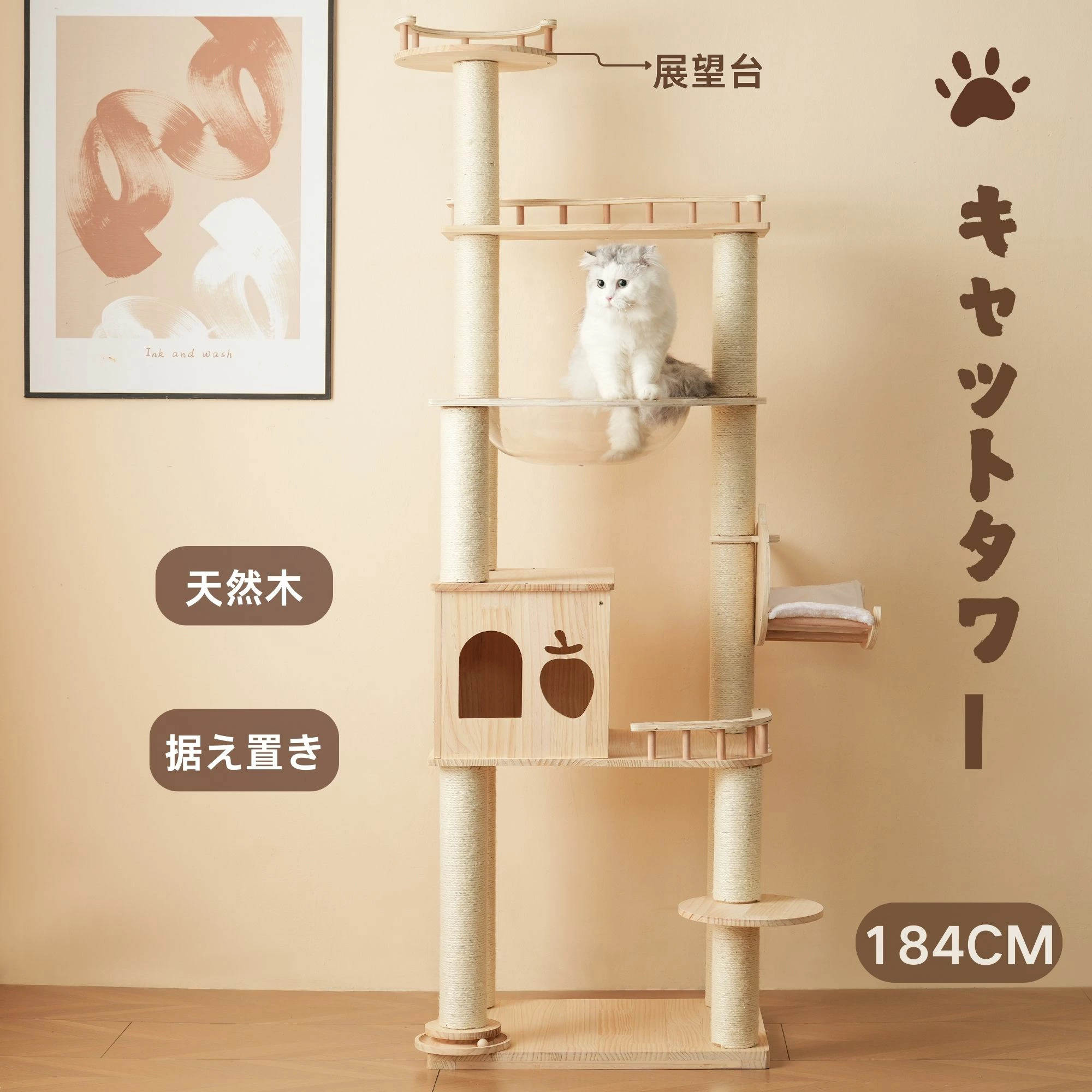キャットタワー 猫タワー キャットツリー スリム 高さ173.5cm 据え置き ネコタワー 上り下りしやすい 爪とぎポール 木製 可愛い 子猫 大型猫 ペット用品 おしゃれ