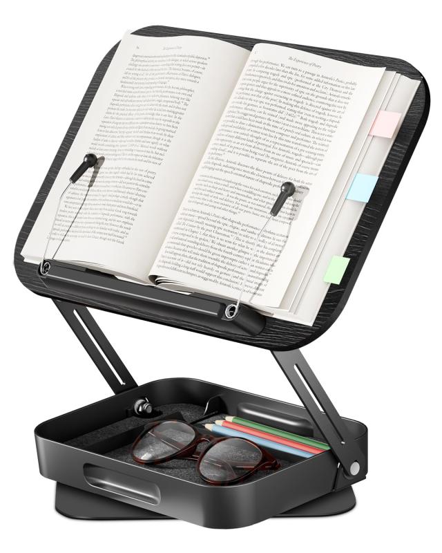 【送料無料】ブックスタンド 書見台 読書台 360度回転式台座 無階段高さ調節 折りたたみ式 鉄製台座 安定性抜群 持ち運びやすい ページ捲り簡単 木目 ダークウッド おしゃれ