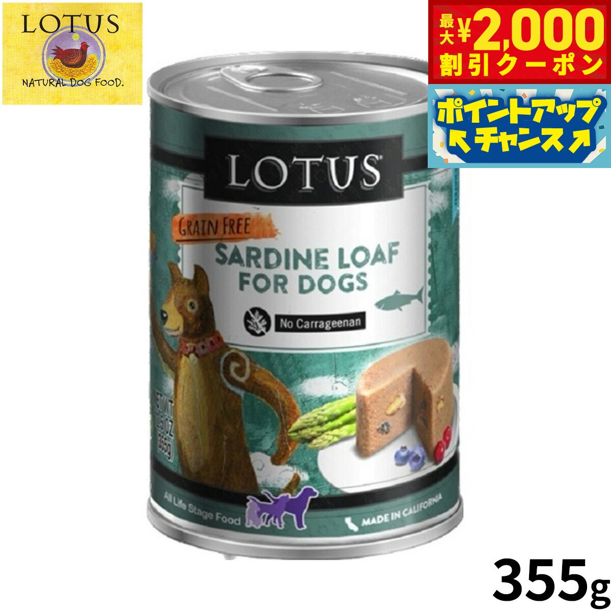 【最大2000円OFFクーポン!&店内ポイント最大52倍!本日限定!】ロータス ドッグフード グレインフリー 無水調理ウェットフード サーディンローフ 355g 穀物不使用 無添加 ナチュラルフード