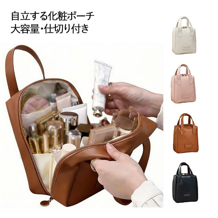 ブラウン コスメ整理 大容量 仕切り収納 メイクポーチ コスメポーチ 化粧ポーチ 自立 縦型 トラベルポーチ 収納 旅行用 防水 ハンドル付き シンプル おしゃれ 化粧ポーチ アプリコット ピンク