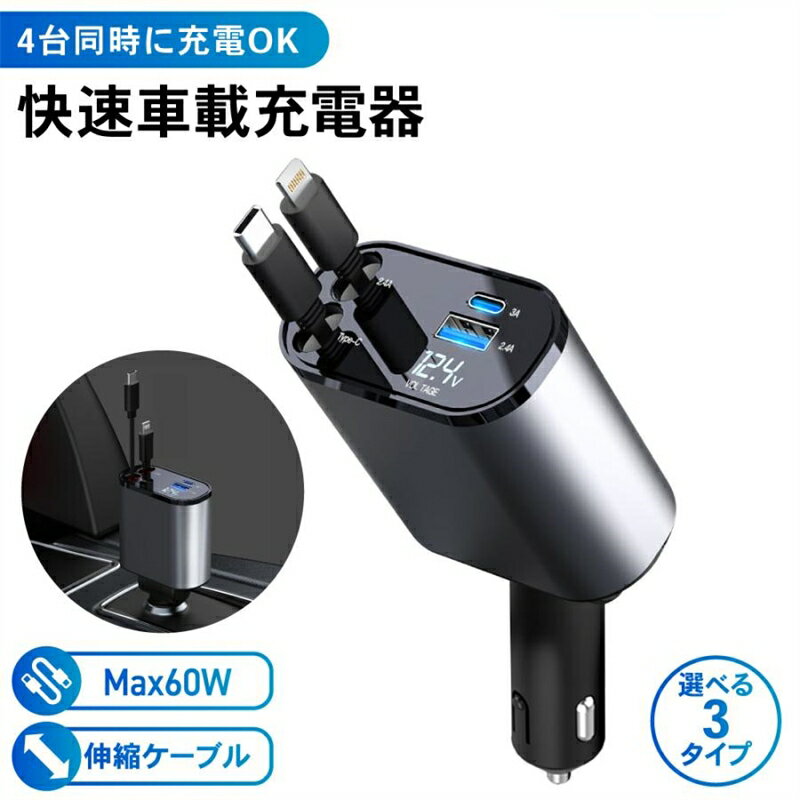 GJ系 MAZDA6セダン マツダ6セダン シガーソケット用充電ケーブル&ポート 4in1 USB 充電器 PD 60W 急速 Type-C Lightning ケーブル内蔵 巻取式 2ポート
