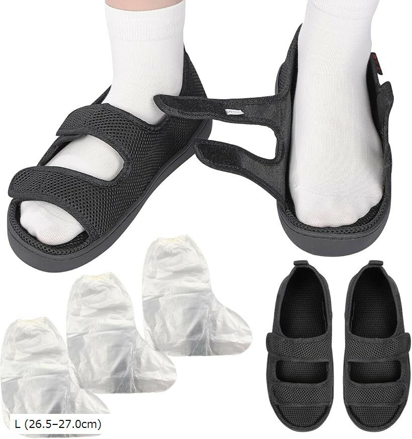 骨折靴 介護用靴 術後用シューズ リカバリーシューズ 骨折した時の便利グッズ ケガ用 骨折サンダル 歩行補助 調節可能 着脱が簡単 通気性 軽量 滑り止め 入院シューズ 男女兼用 (ブラック, M)