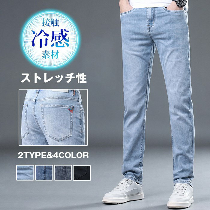 デニムパンツ 接触冷感 メンズ アイスシルク 夏 ロングパンツ ジーンズ ストレートパンツ ストレッチ デニム 冷感デニム ゆったり 涼しい ひんやり パンツ 涼感 薄手 快適 無地