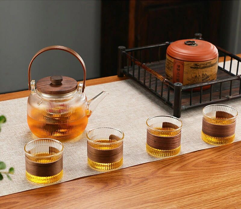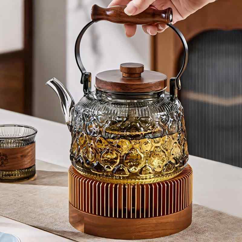 ガラス製ポット 耐熱ガラス 急須 ガラス急須 ハンドル付き 茶こし付き クルミ持ち手 ガラス ティーポット 直火対応 直火 直火可 ジャンピング 紅茶ポット フルーツティー 花茶 工芸茶