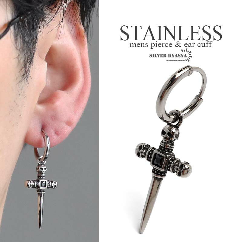 ステンレス製 ソードピアス 剣 フープピアス 髑髏 揺れる シルバー ドロップピアス 一粒のストーン スカル クロス ユニーク 燻し風 片耳1点 プチプラ メンズ 男性 金アレ対応 父の日