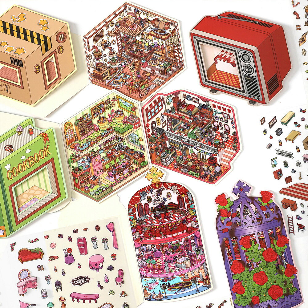 ハウスステッカー 3d 造景シール 立体シール かわいい 手帳用シール デコ 造景シール シーン 紙素材 コラージュ ミニチュアハウス ストレス解消 おもちゃ ピンセット付き